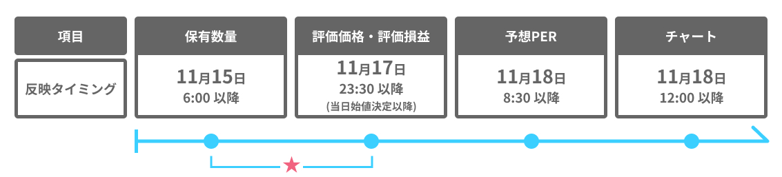 また、分割による保有残高の反映と分割後の価格の反映のタイミングが異なることにより、正しい時価評価額が表示されない時間帯が発生します。