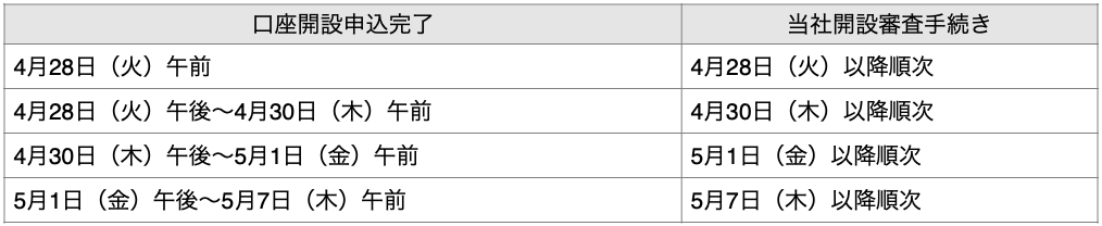 - 5月1日(金)15:30(一部銘柄は15:00)以降、5月6日(水・祝)までにご入力いただいたご注文は、5月7日(木)15:30(一部銘柄は15:00)までのご注文と同じ扱いとなります。