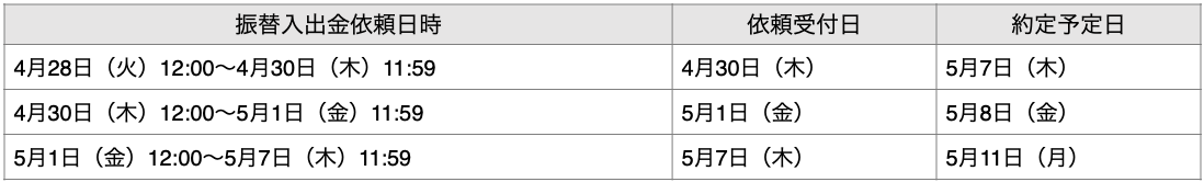 原則、振替入出金の入出金依頼日時と約定日時等については、下記の通りです。