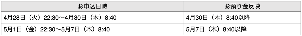 国内休業日前日22:30~国内休業日翌営業日8:40の間のお振込みおよびご出金のお申込みにつきましては、国内休業日翌営業日8:40以降に反映いたします。